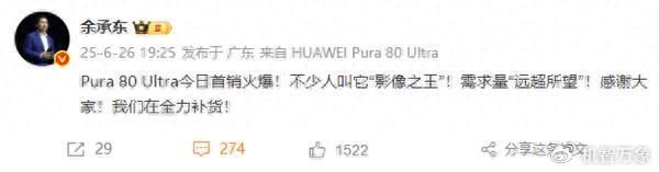 对于近期消费市场对Pura 80 Ultra供不应求的各种“吐槽”,日前,@余承东 直接发微博进行了回应,据其称,“Pura 80 Ultra今日首销火爆!不少人叫它‘影像之王’!需求量‘远超所望’!感谢大家的支持!我们现在正在全力补货!”此外,有粉丝在评论区为余承东加油鼓劲:“加油余总,Pura系列不愧影像之王。”