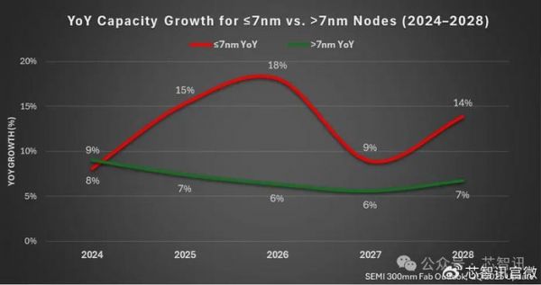 这一增长的一个关键驱动力是7nm 及以下先进工艺产能的持续扩张,月产能将自2024年的85万片,扩增至2028年的140万片,年复合增长率达14 %,为半导体业平均水准的2倍。