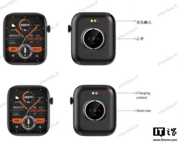 参考相应渲染图,这款智能手表采用 1.9 英寸方形屏幕,右侧提供可旋转的表冠按钮,配备硅胶运动表带,手表支持心率和血氧监测功能,同时支持常规蓝牙通话、音乐控制、闹钟等基础功能,使用触点充电。