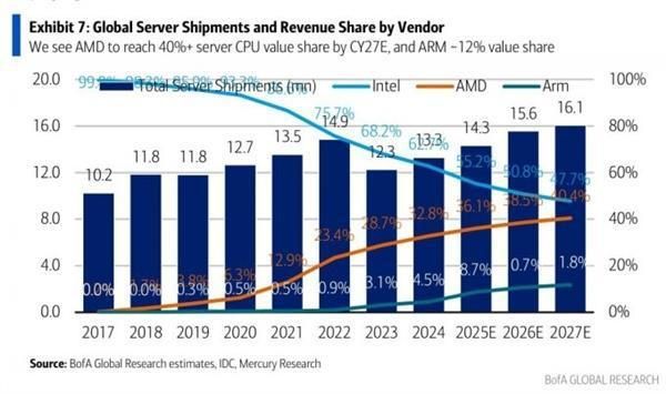 展望未来,到2027年AMD可能达到40%的市场份额,而英特尔预计将跌破象征性的50%大关,ARM处理器可能会继续稳步上升,可能达到10%到12%。