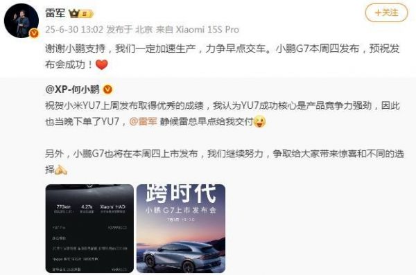 雷军也是第一时间回应何小鹏下单小米YU7。“谢谢小鹏支持,我们一定加速生产,力争早点交车。小鹏G7本周四发布,预祝发布会成功!”