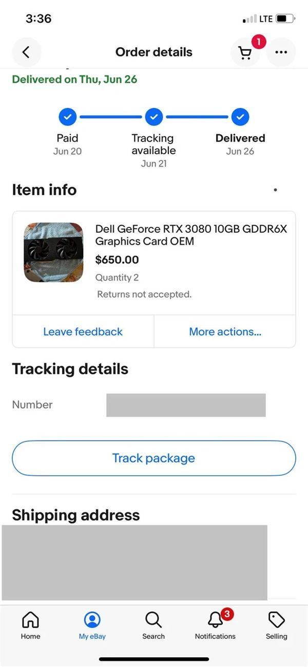 该用户表示,他在6月早些时候以650美元的价格购买了两张RTX 3080显卡,这两张显卡分别来自两个独立的eBay拍卖,每张显卡的售价为325美元,标的名称为"戴尔GeForce RTX 3080 10GB GDDR6X显卡"。