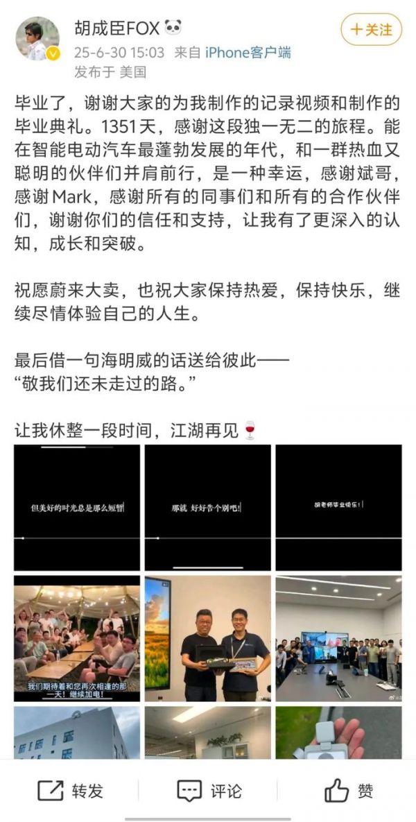 近日,蔚来汽车技术规划首席专家、助理副总裁胡成臣在其个人微博上正式宣布离职。