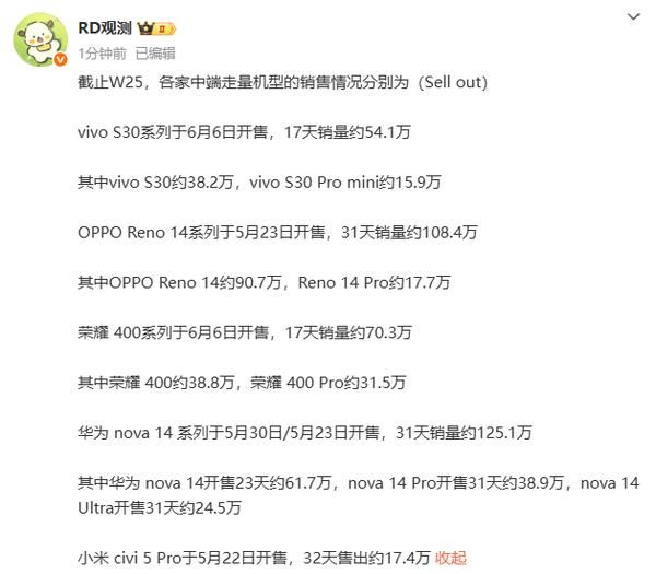 华米OV耀五大中端机型销量曝光:nova 14超125万部