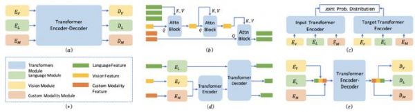 编码式框架(Encoding-based Framework)旨在通过构建一个共享的特征空间来统一不同的输入模态,并使用 Transformer 等模型进行编码。这类框架通常包括领域特定的编码器来处理不同类型的数据,如图像、文本和音频,然后通过共享的 Transformer 结构进行进一步处理,最终生成统一的输出。