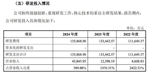 摩尔线程营收虽然三年暴涨近10倍,但是即使是营收最多的2024年,一年的营收还不够当年研发投入的三分之一,2024年摩尔线程研发投入高达13.59亿,是当年4.38亿营收的309.88%,而在两年前的2022年这个投入比重更是高达2422.51%。