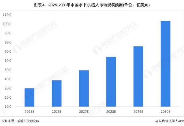 前瞻预测,中国水下机器人市场规模预计在 2030 年将涨至 103.3 亿美元,呈现出 28.3% 的年复合增长率,增长速度高于全球增速。