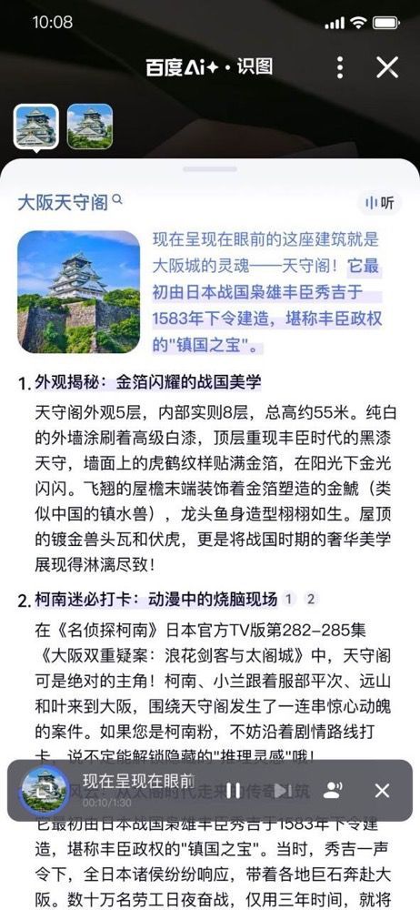 搜索不仅可以理解文字。现在,用户仅需要输入一张大板天守阁的照片,无需输入文字,AI即可理解用户的搜索需求,给到可以当做导游宣扬的结构化内容,甚至还能生成音频。