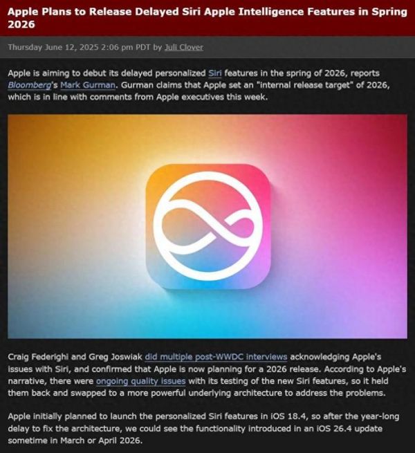 彭博社记者Mark Gurman曾表示,新Siri预计要延迟到2026年3-4月份,届时将随iOS 26.4系统更新推出。