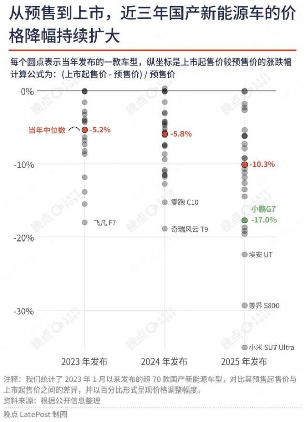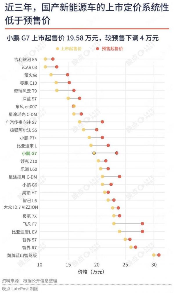 G7 借用从预售到上市的价格差来促销量,这并不是新鲜事。预售是汽车行业常见的新车上市策略,曾经是车企试探市场需求、收集潜客、灵活定价的一种常见手段,最终上市定价与预售价之间的差距一般都在消费者的预期之内,但 “超预期” 的降幅在近三年变得越来越普遍。
