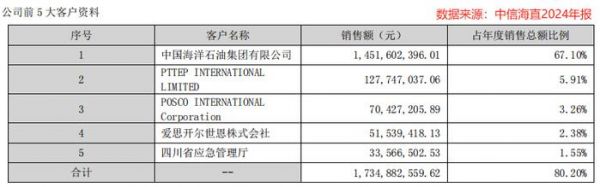 长期以来,中海油一直是公司最大客户,2022-2024年中海油的销售额,在公司年度总销售额中的占比分别高达67.81%、67.66%、67.1%。
