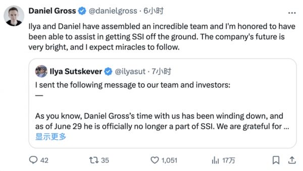 在被小扎撬走了联创后,Ilya本人刚刚对这件事做出了回应,证实Daniel Gross已经离开SSI。