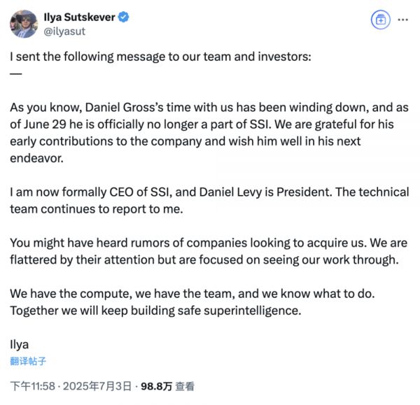 离开之前,Daniel在SSI担任的职位是CEO,Ilya则是首席科学家,现在,CEO的职位被Ilya接手,同时Ilya继续听取技术团队的汇报。