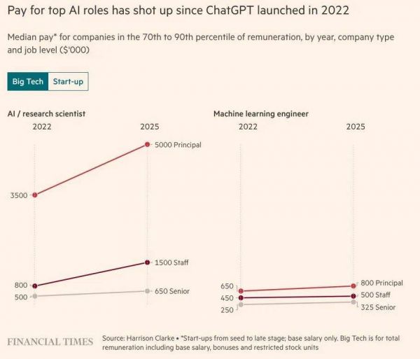 从2022年到2025年,不管是大科技公司还是初创公司,这些顶尖技术人员的薪资涨幅都有了大幅提升。
