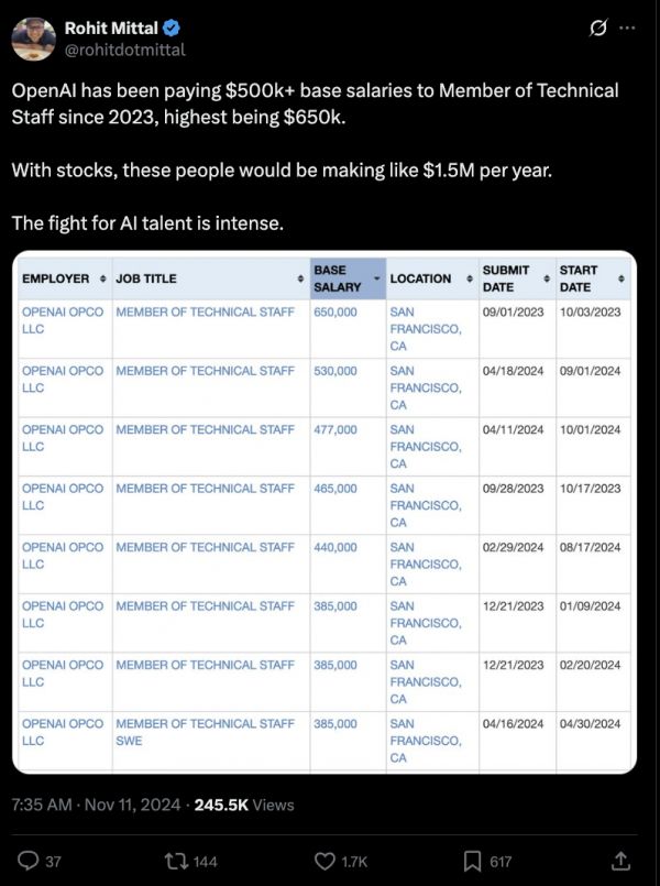 去年11月曾爆料,OpenAI自2023年起,一直向技术人员支付50万美元以上的基本工资,最高可达65万美元。如果加上股票,这些人的年薪将达到150万美元。