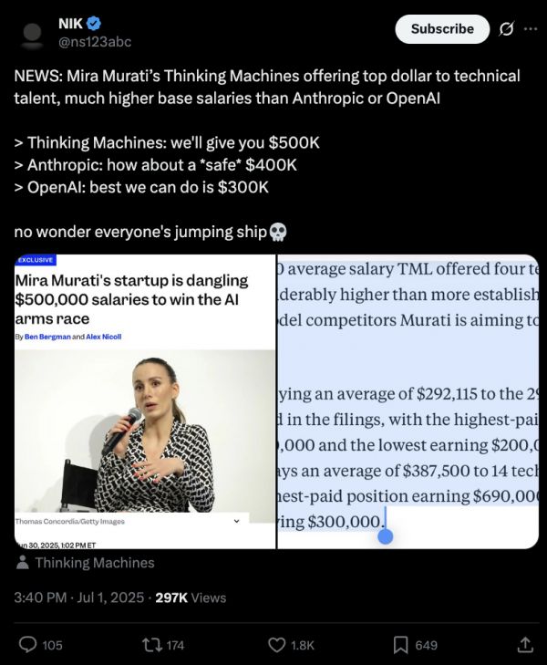 她能给到技术人员的薪资可以达到50万美金。相较之下,Anthropic给40万,OpenAI给的30万,Mira Murati可以说是相当豪横了。