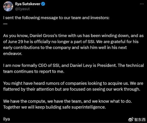 在一则推文中,伊利亚宣布SSI联合创始人兼CEO丹尼尔·格罗斯(Daniel Gross)自当地时间6月29日起已经不再是SSI的一员,而伊利亚本人将亲自接任SSI CEO一职。格罗斯原本在SSI主要负责算力、筹款和人才引进的工作。另据彭博社报道,格罗斯的发言人称,格罗斯将在Meta超级智能实验室从事AI产品研发工作。