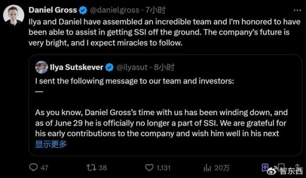 就在Ilya发推1小时后,Gross也直接在X平台上回应称,Ilya和公司另一位联合创始人Daniel Levy组建了一支出色的团队,他很荣幸能够协助SSI起步。公司的未来一片光明,他期待SSI做出奇迹般的成果。