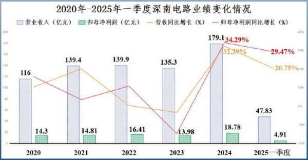 2025年一季度,深南电路业绩继续向上突破,实现营收47.83亿元,同比增长20.75%;实现净利润4.91亿元,同比增长29.47%。
