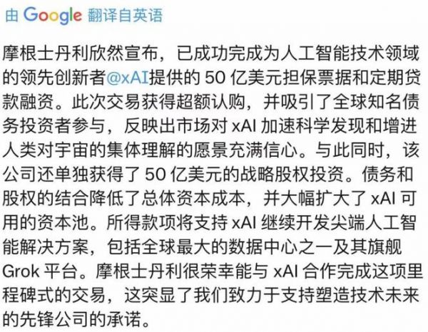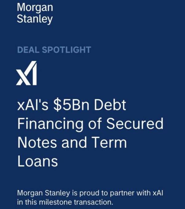 据了解,摩根士丹利在xAI此次50亿美元债务融资中扮演了顾问角色,并指出该债务融资实现了超额认购,众多知名全球债务投资者纷纷加入其中。