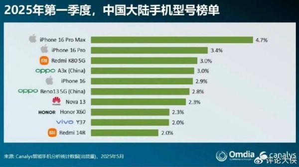 排名1-5机型:iPhone 16 Pro Max、iPhone 16 Pro、Redmi K80 5G、OPPO A3x以及iPhone 16。国内最受欢迎的手机机型前五名,苹果手机占了3个,iPhone 16 Pro Max排在榜首位置,市占率约4.7%。