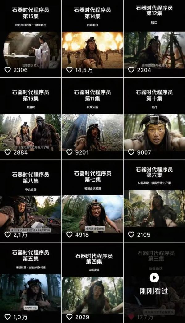 根据世超的观察,除了一些纯纯做着好玩的账号,已经有几个账号开始系统性地打造AI虚拟IP了,就比如大脚怪的日常,还有生活在石器时代的程序员等等,视频都是AI生成的,但账号人设又各有特点。