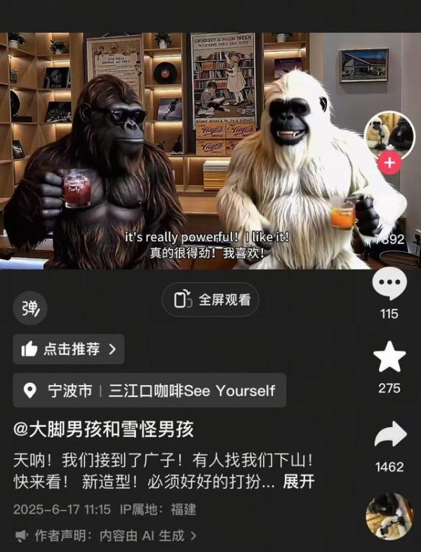 有咖啡店找博主做植入,植入的形式,就是让大脚怪和雪怪拍一个探店vlog,更准确的说,是让AI生成。