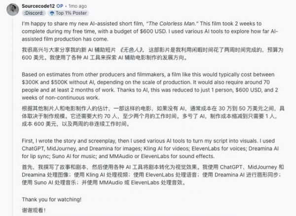 国外独立制作人Hashem Alghaili,用AI辅助创作了一个十几分钟的短片《无色人》,只用了600美刀的预算和两个星期的时间。