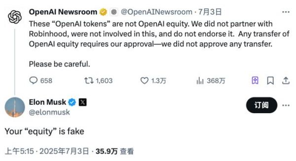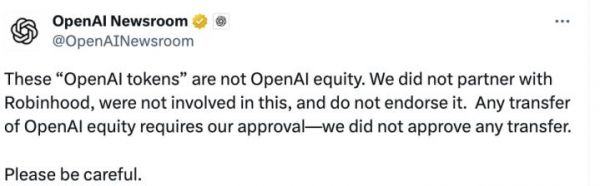 “这些‘OpenAI 代币’并非 OpenAI 股权。我们没有与 Robinhood 合作,没有参与此事,也不为其背书。任何 OpenAI 股权的转让都需要我们的批准——我们从未批准过任何转让。请谨慎操作。”