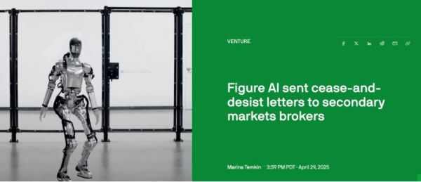 今年3月时,机器人初创公司Figure AI发现,自己在二级市场非常受欢迎,简直是私募股票第一名。于是忙不迭地向至少两家股票经纪商发去停止令函,要求他们停止营销Figure AI的股票。