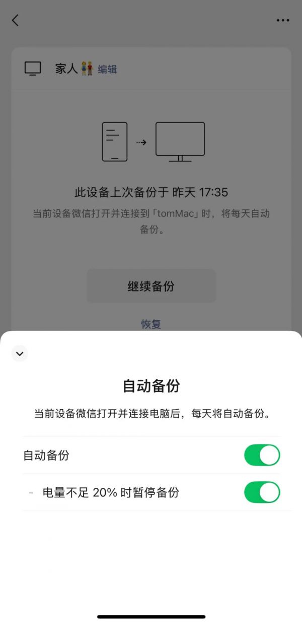 其次,微信也给这项「外部存储备份」加入了自动备份的功能。开启自动备份后,我们不再需要每周(或每天)手动打开电脑端微信,然后把手机放在路由器旁「静候」几个小时(微信备份时需要保留前台 App),只要手机识别到已设置的电脑或外部存储设备,就会自动进行备份。