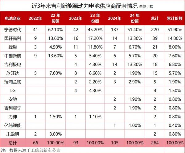 纵观2023年到今年初吉利新能源申报的车款中,涉及的电池供应商就包含了宁德时代、蜂巢、国轩高科、中创新航、亿纬锂能,当然也包括自己旗下的衢州极电和耀宁,吉利虽然没有特别强大的电池自供能力,但吉利作为目前除比亚迪以外最大的新能源车企,要找到充足的动力电池供应保障不是问题。