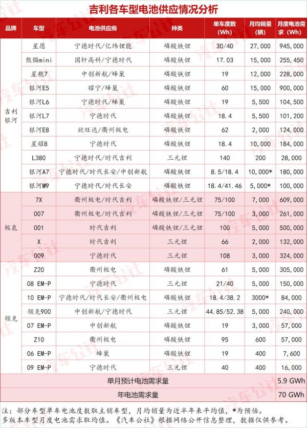 简单根据目前吉利旗下银河、极氪、领克所有规划,和在售车型对动力电池需求和销量来看,2025年全年吉利对电池的需求就将会达到70GWh,但到2027年吉曜通行才能够达到这个能力,再加上以吉利控股来说,无论是沃尔沃、路特斯还是宝腾,以及商用车集团的远程品牌,这一块领域对电池的需求也并不小。