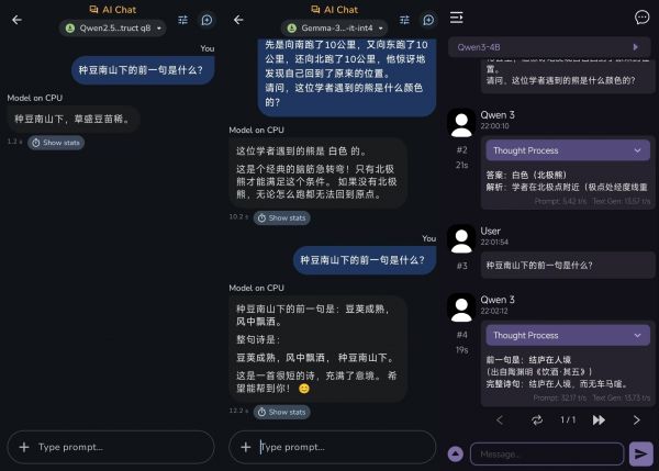 如图所示,谷歌为这款应用默认准备了四款模型,其中有自家的Gemma系列,也有来自通义千问的Qwen系列,我们选择了目前最强的Gemma 3n-4B和通义千问的Qwen2.5-1.5B以及额外部署的Qwen3-4B GGUF进行测试。
