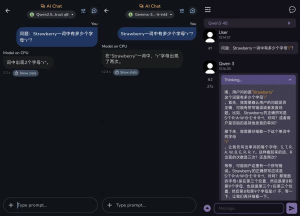 实测下来,没有深度思考能力的Gemma 3n-4B和Qwen2.5-1.5B依然会回答“2个”,有深度思考能力的Qwen3-4B GGUF则能够给出正确答案“3个”,只是莫名其妙的反复思考让它整整生成了两分半钟,还挺浪费时间的。