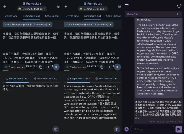 其中,Gemma 3n-4B和Qwen3-4B GGUF都算是能完成任务的,不过因为Gemma 3n-4B原始语言是英文,因此给出的总结也是英文的,而Qwen3-4B GGUF则能够提供中文的文章总结。