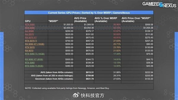 RTX 5090也差不多,实际平均售价超过了3050美元,高了50%以上。