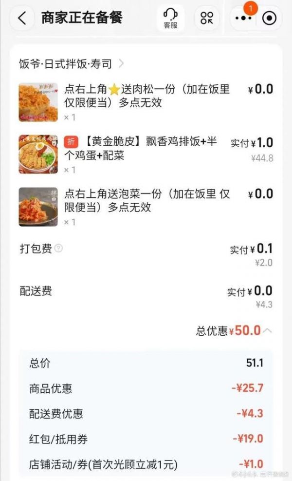 济南市民张先生也参与到了这场“外卖大战”当中,作为淘宝闪购的新用户,平台补贴和新人优惠叠加之后,一份原价51.1元的鸡排套餐只花了1.1元。不过这样的外卖大战对于不急用餐的消费者来说是薅羊毛的福利,但对于急需就餐的顾客却是一场“灾难”。小杰从潍坊来济南出差,下午两点时从潍坊出发在高铁上提前点好的晚餐,六点到济南时还没收到。“没办法,晚上7点的活动,只能饿着肚子晚点再说了。”也有不少网友表示,美团平台一崩,自己的外卖券也失效了,联系客服处理都要“排队”。