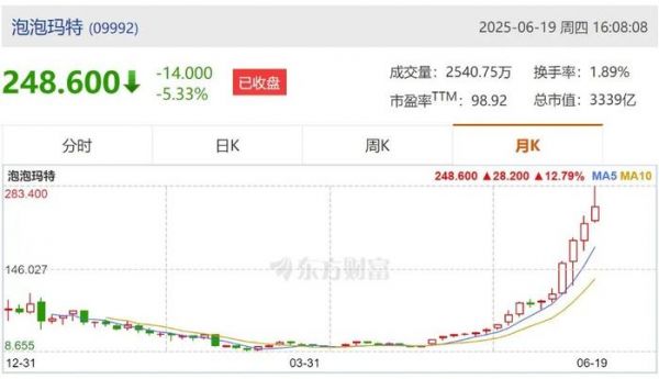 据泡泡玛特2025年的月K线图显示,前期股价长期在低位区间震荡,随后6月19日,收盘价248.60元,较前期低点大幅攀升,5月均线(MA5)、10月均线(MA10)同步向上发散,LABUBU产品爆火带来的是股价大涨,市场竞争力与影响力持续提升。