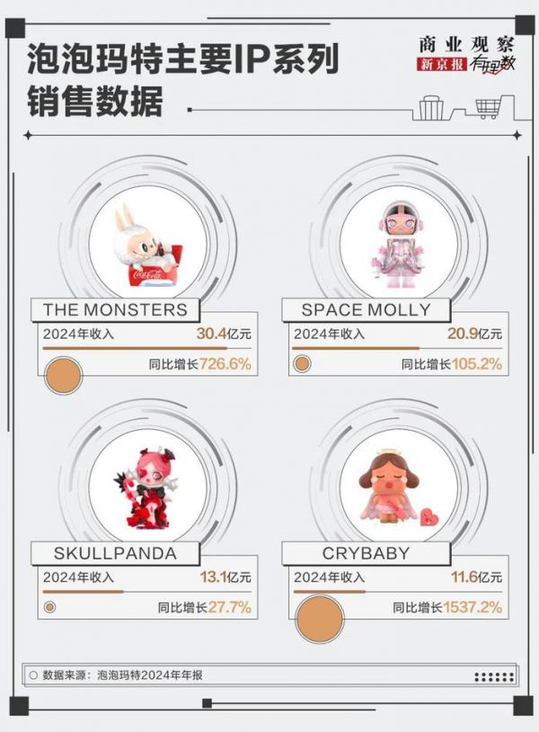 当然,LABUBU的爆火并不是一朝一夕的,从市场逻辑看,这与公司IP运营成果紧密相关,2024年THE MONSTERS等四大IP营收都破了10亿。