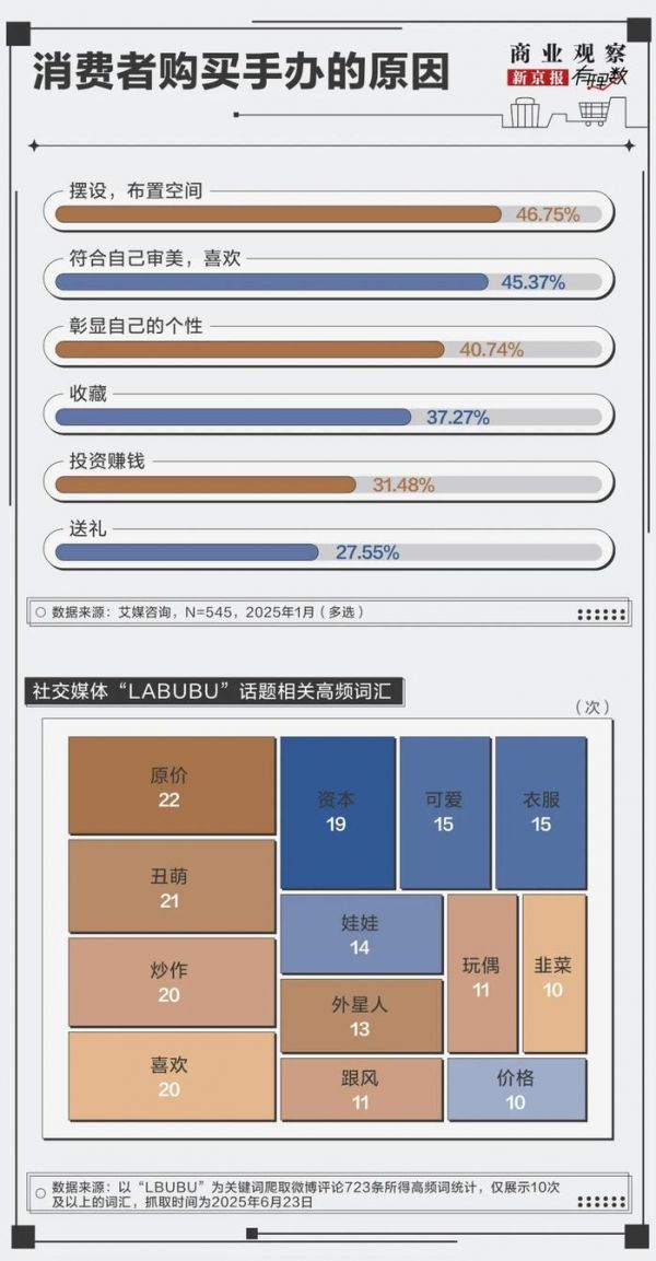 消费者在购买盲盒、手办等物品时多会购买符合自己审美、彰显个性的商品,LABUBU“邪恶萌”、“丑萌”的形象新颖别致,可能符合消费者喜爱特别款式的心理,彰显个人的独特个性。LABUBU的系列众多,可以引起消费者“收集全图鉴”的心理,具有一定的收藏价值。同时,盲盒机制也会导致不同款式的玩偶价格波动,部分消费者可以利用盲盒机制导致的价格不确定性二次转手贩卖,符合“投资赚钱”的消费心理。