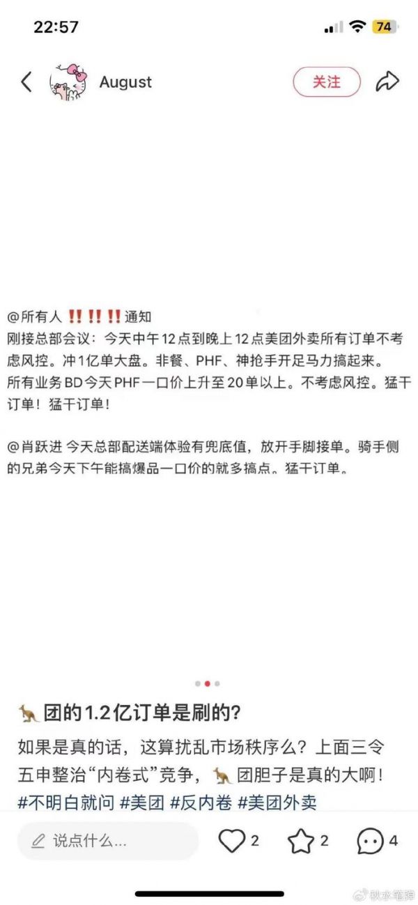社交媒体上流传的疑似关联方内部截图显示,为了冲击单日1亿单,美团要求当天“中午12点到晚上12点的订单不考虑风控”,非餐饮订单、PHF(拼好饭)、神抢手(美团的一个优惠板块)统统“猛干订单”。