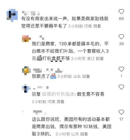 结果有商家表示,自己连续在美团接了130单,都是薅羊毛的,平台根本不给补贴,套餐的价格还不如打包盒的成本高。