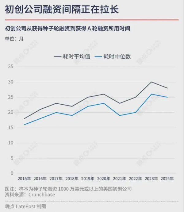 Cruchbase 数据显示,2024 年获得 A 轮融资的公司在种子轮和 A 轮之间的耗时中位数达到 25 个月,是近十年高位。