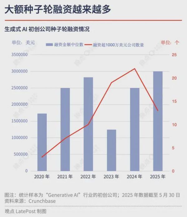 不止明星公司拿到越来越大的支票。Cruchbase 数据显示,GPT-3 刚上线的 2020 年,生成式 AI 初创公司种子轮融资规模中位数还是 170 万美元左右;今年截至 5 月,中位数则涨到 300 万美元。退回十多年前,字节跳动 A 轮才融了 500 万美元。