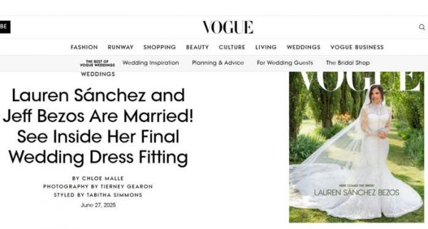 在6月底桑切斯登上这本时尚杂志封面并且配发一篇介绍她选婚纱的长文之后,有消息称贝佐斯凭着“雄厚的财力”可能成为《Vogue》母公司康泰纳仕的所有者。