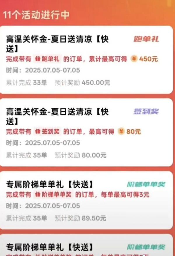 一位南京的美团众包骑手告诉《科创板日报》记者,7月5日自己工作9个小时到手1600元。据该骑手介绍,只要达到30单,光高温关怀金就有450元的奖励,此外还有天降随机奖,以及特定时段的专属跑单礼等等激励。