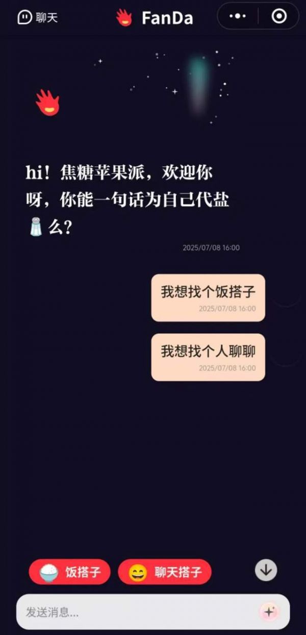 FanDa则是定位专注于为年轻人提供高效便捷的搭子匹配、社交互动、个性化约会规划的AI社交平台。