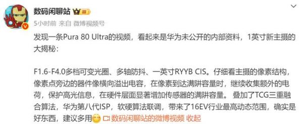 视频内容显示,华为Pura80 Ultra一英寸主摄为行业最强。这颗传感器支持F1.6~F4.0多档可变光圈,支持多轴防抖,还采用华为独家RYYB像素排列。为了增强在暗光场景下的表现,华为经过多项软硬件升级,实现行业最高16EV动态范围,这项技术只有华为能做到,友商未来也要用。