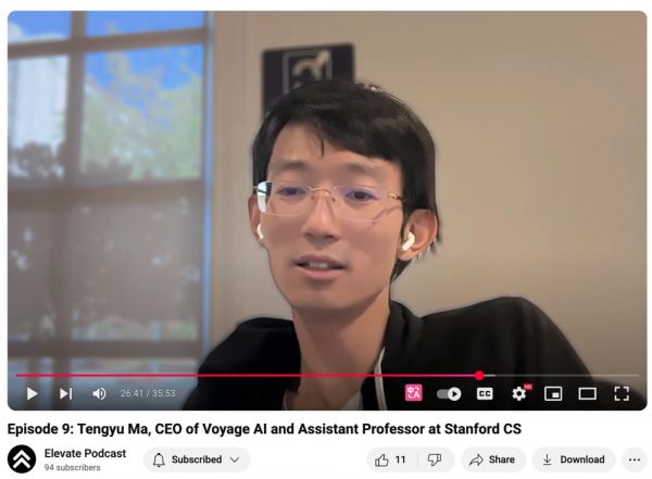 马腾宇是斯坦福大学计算机科学系助理教授,也是Voyage AI的联合创始人兼首席执行官。